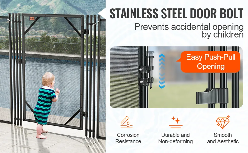 Innovador pestillo de acero inoxidable: La estructura de bloqueo simple con un interruptor push-pull hace que abrir y cerrar la puerta de la piscina enterrada sea sin esfuerzo. El pestillo está situado a 20 cm por encima de la puerta para mejorar la seguridad y evitar la apertura accidental por parte de los niños.