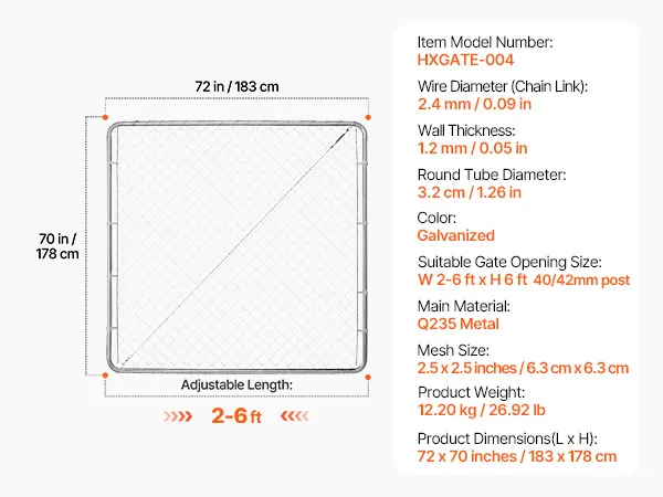 VEVOR Puerta de Valla de Eslabones de Cadena 183x178 cm Panel de Valla de Eslabones de Cadena Ajustable Puerta de Valla Galvanizada Resistente a la Oxidación para Abertura de Valla, Poste No Incluido