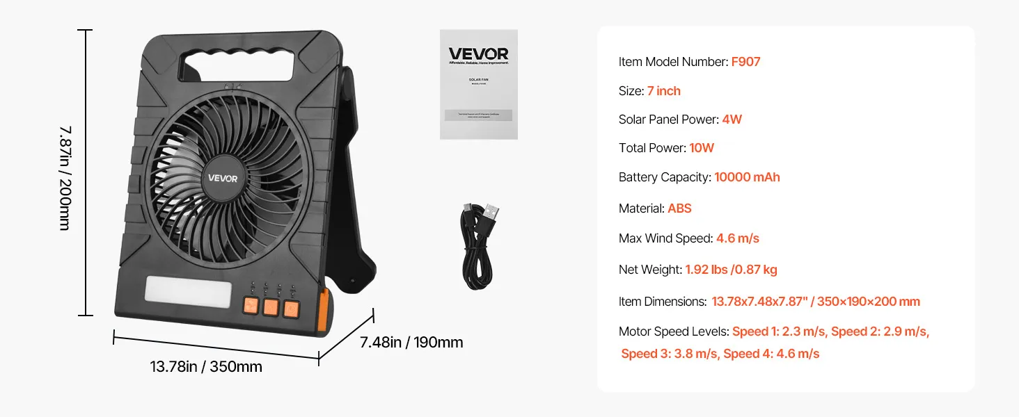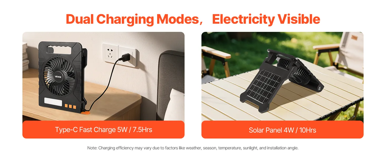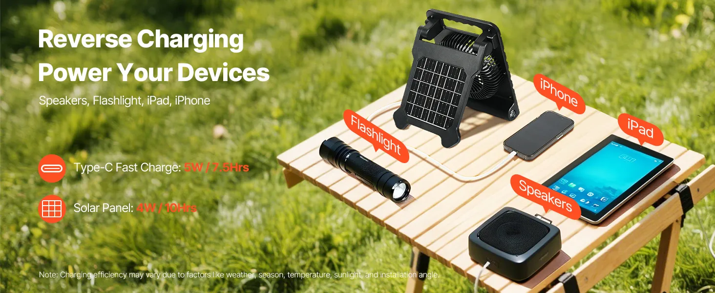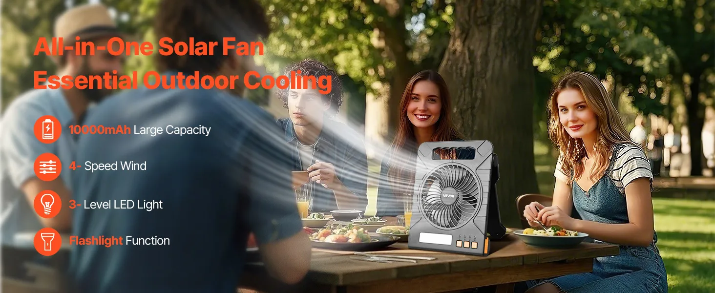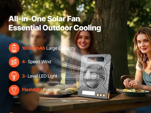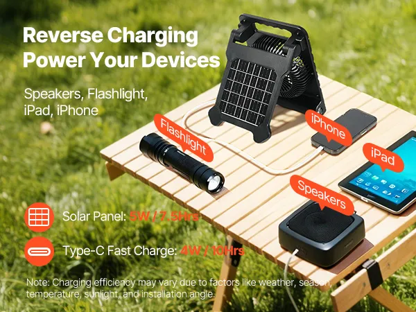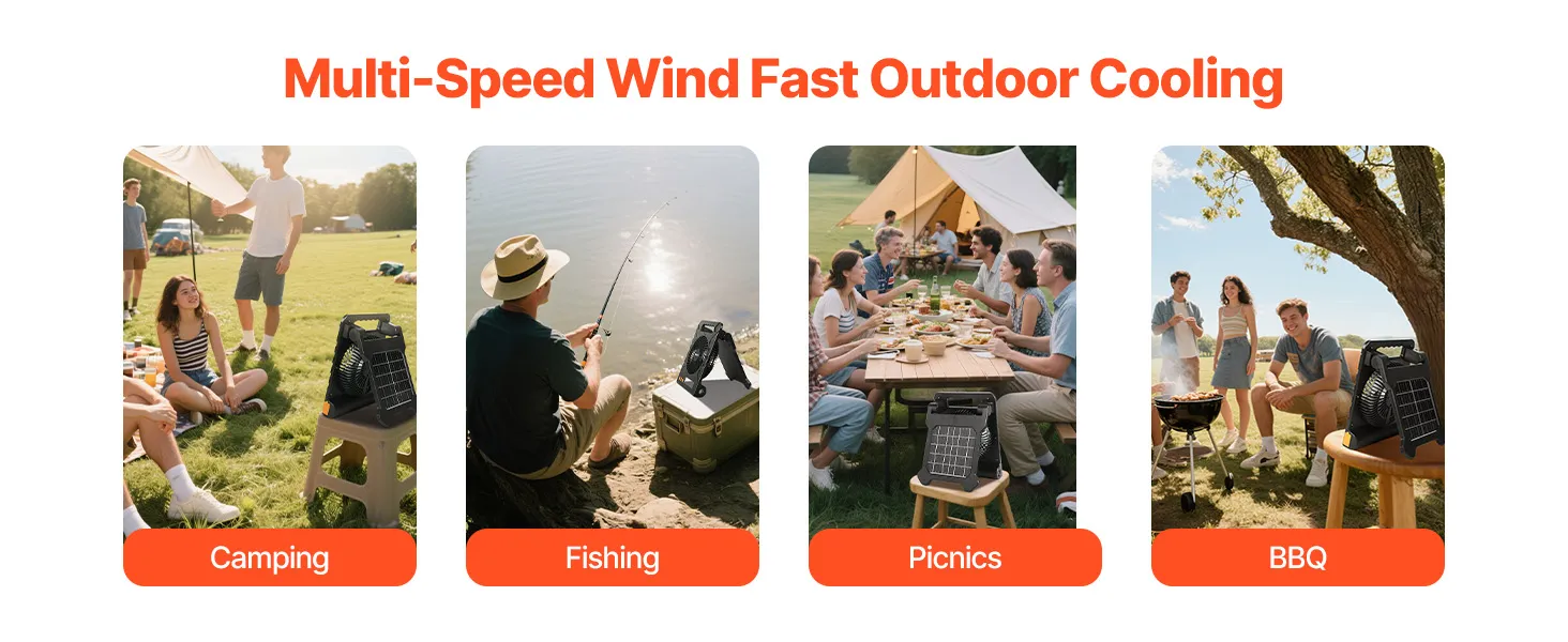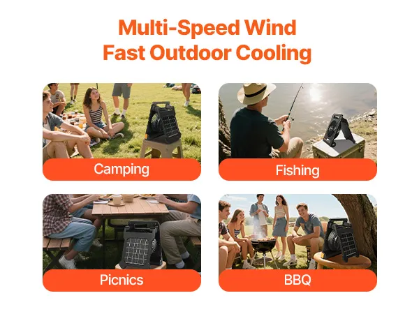 Ya sea que esté acampando, pescando, haciendo un picnic o asando a la parrilla, este ventilador solar de múltiples velocidades enfría rápidamente el aire, lo que le permite disfrutar plenamente de sus actividades al aire libre.