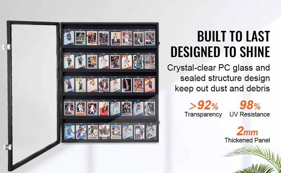Experimente una pantalla cristalina: nuestras vitrinas para tarjetas cuentan con paneles de vidrio de PC con una transparencia excepcional (más del 92 %) y protección UV (98 % de resistencia a los rayos UV), lo que brinda una experiencia de visualización de alta definición. Sus tarjetas se mantienen vibrantes y resisten la decoloración o la decoloración, incluso bajo exposición prolongada a la luz. ¡Invierta hoy en calidad y protección para sus recuerdos!