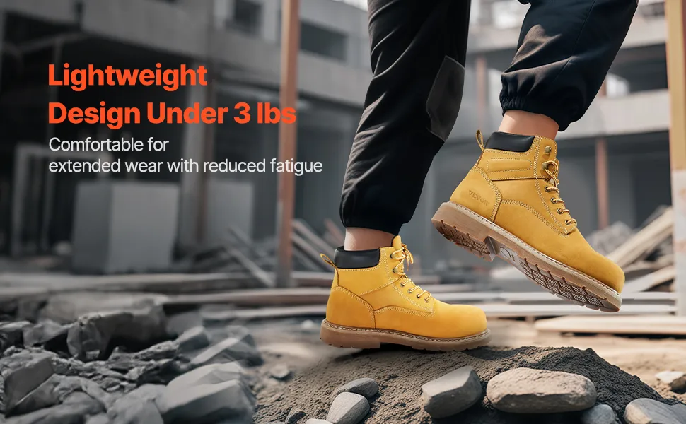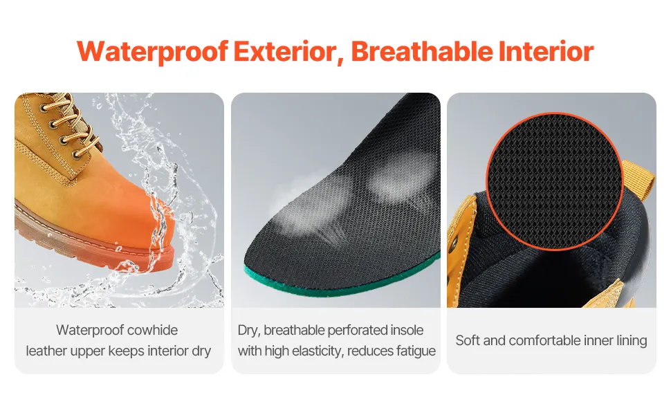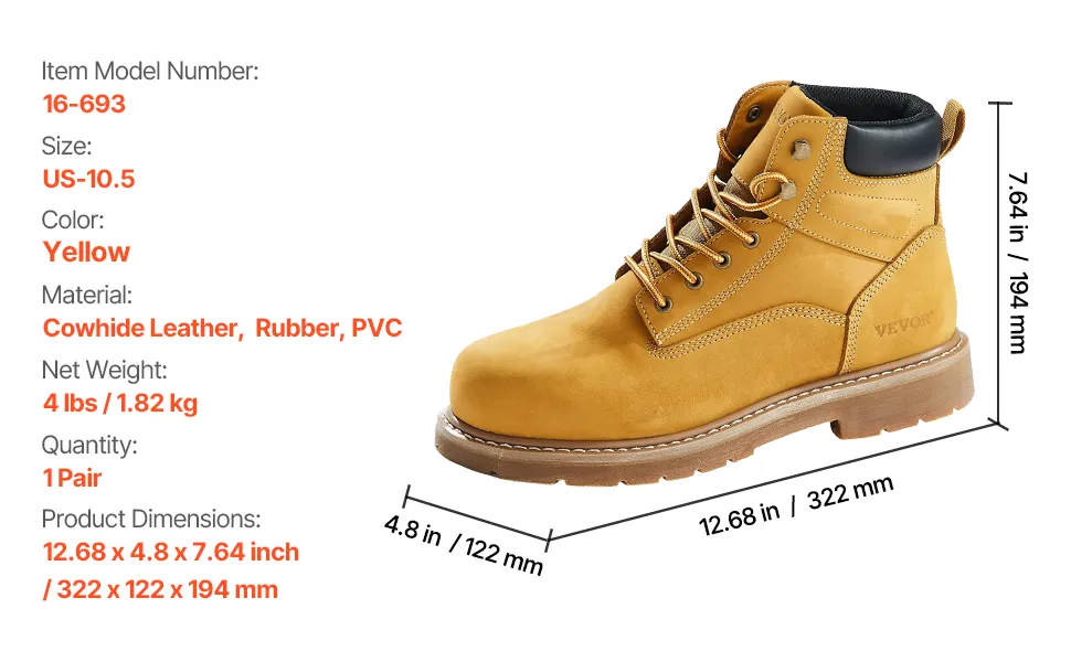 VEVOR Botas de Trabajo, Talla 10,5 EE. UU., con Punta Acero Impermeable, Antideslizante, Transpirable con Suela de Goma Ligera para Industria de Construcción, Amarillo Parduzco, 322 x 122 x 194 mm